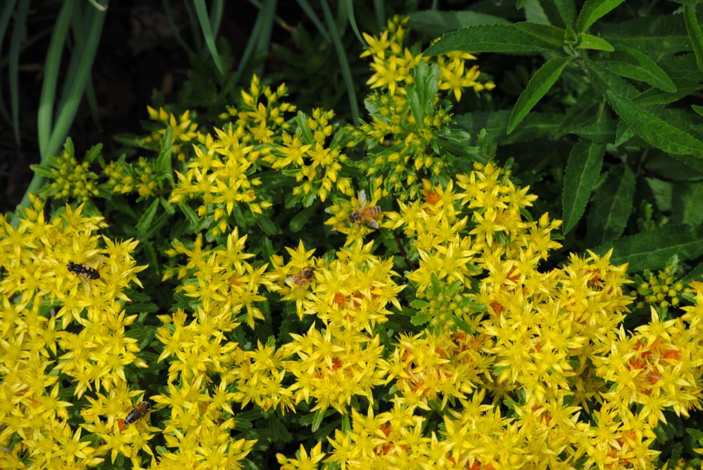 S. acre Golden Carpet, S. divergens Old Man’s Bones, S. rupestre/ S. reflexum Angelina and Blue spruce, S. spectabile Autumn joy, S. spurium Dragons Blood, S. kamtschaticum Russian.