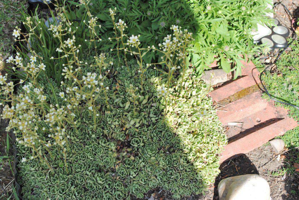 Encrusted Saxifrage – Saxifrage paniculata has flat, leathery, blue-green leaves with a white raised edging around each leaf. Rosettes grow in a mound and have white flowers with purple dots. Note* Mossy Saxifraga – Saxifraga arendsii is more fern-like and prefers shade and moist soil.
